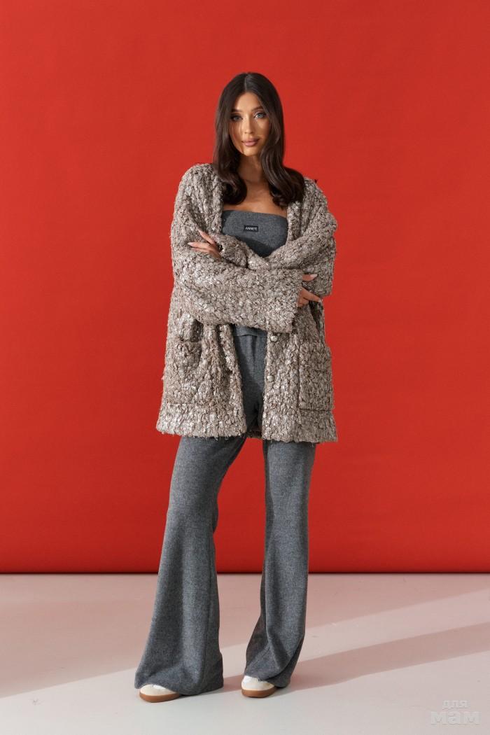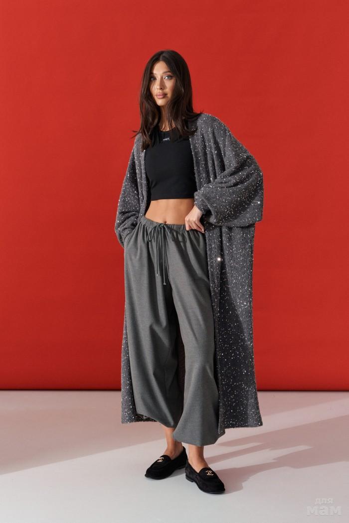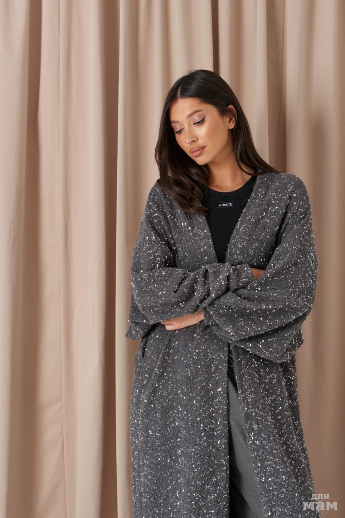Джемпер удлинённый (кардиган). Выполнен из мягкой пушистой ткани серого цвета с пайетками. Без подкладки. Вырез горловины V-образный. Рукав втачной, спущенный, с манжетой. Застёжки в изделии нет. На уровне линии талии нашиты шлёвки. В комплекте пояс из основной ткани. Длина спинки 129 см. Длина рукава от линии втачивания 54 см (длина рукава от горловины 82 см)