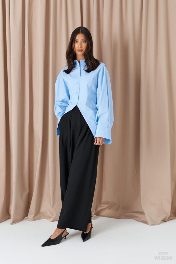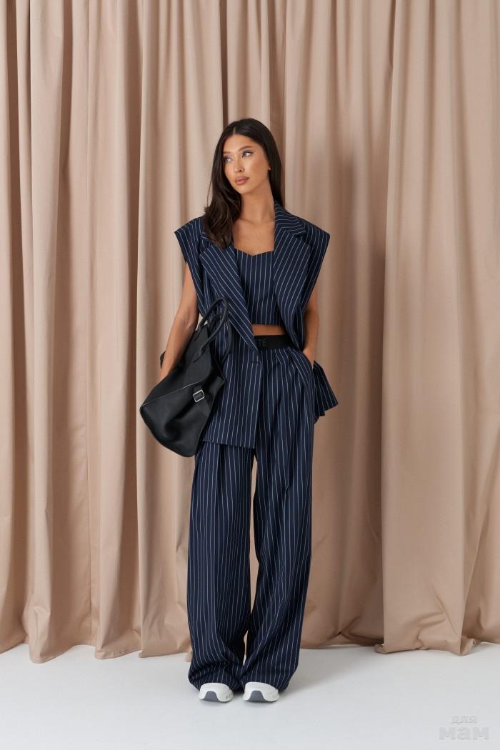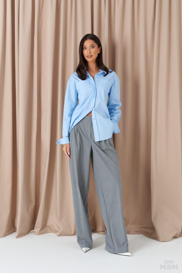 Брюки прямого свободного кроя. Выполнены из костюмной ткани синего цвета с полоской голубого цвета. Пояс на резинке чёрного цвета (брендированной). От пояса складки. По передней части заутюженные стрелки. Имитация застёжки. Наклонные карманы из боковых швов. Длина 112 см