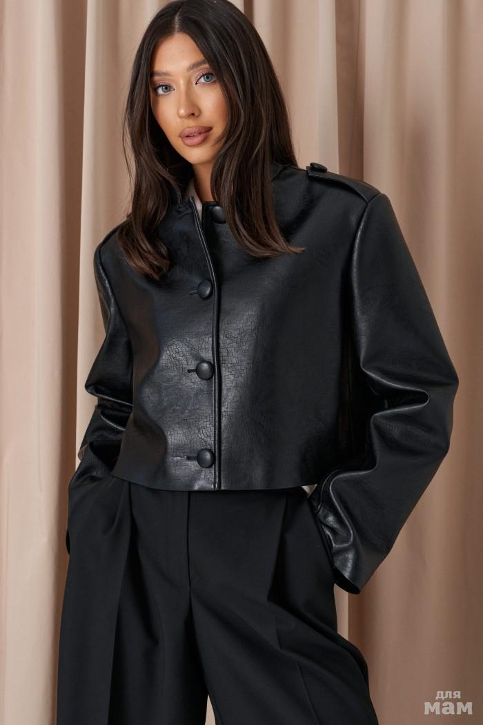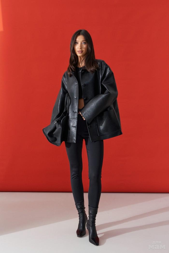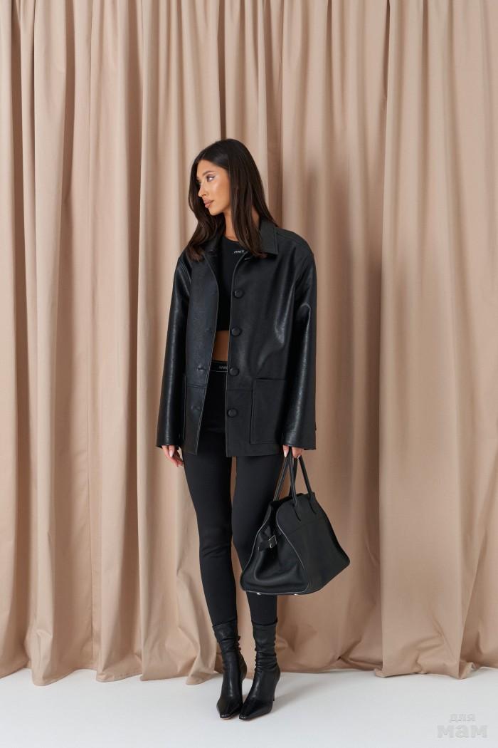 Жакет прямого свободного кроя. выполнен из фактурной эко-кожи чёрного цвета. С подкладкой. Воротник отложной. Рукав втачной, немного спущен. По переду накладные карманы. По окружности жакета подрез ниже линии талии. Спинка отрезная. Застёжка центральная пуговицы. Длина спинки 70 см. Длина рукава от линии втачивания 60 см