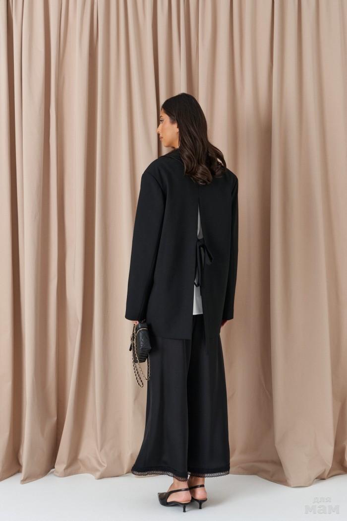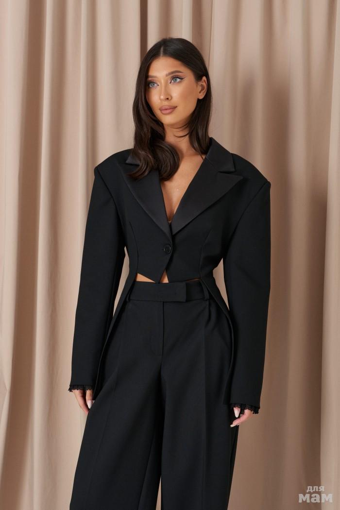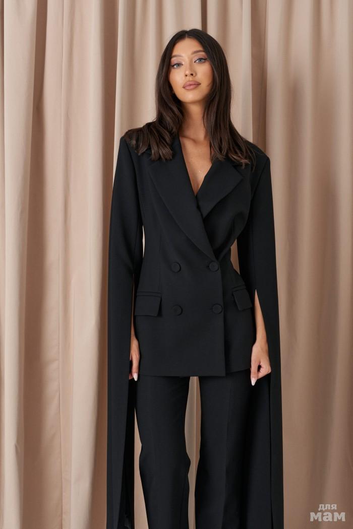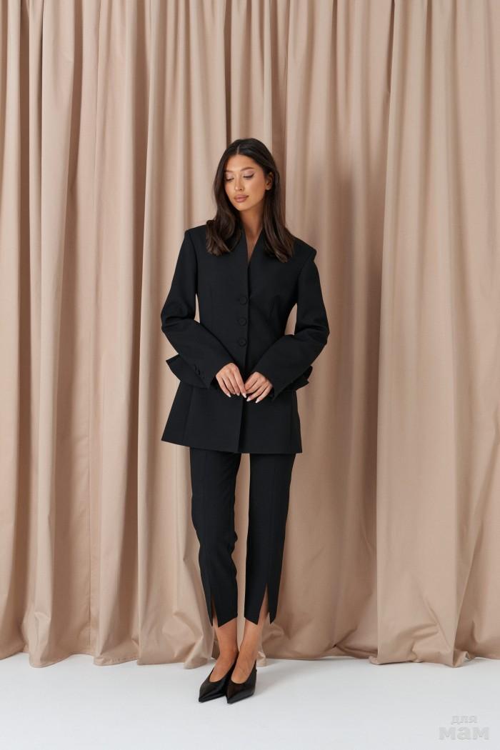 Жакет двубортный прилегающего силуэта. Выполнен из костюмной ткани чёрного цвета. С подкладкой. Воротник отложной, с лацканами. Застёжка центральная пуговицы. Рукав акцентный, удлинённый, с разрезом, с расширением к низу. По переду карманы с клапаном. Длина спинки 70 см. Длина рукава от линии втачивания 119 см. Длина разреза на рукаве 81 см
