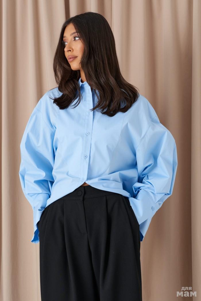 Блузка прямого кроя выполнена из хлопкового полотна голубого цвета. Характеристики: прямой крой, отложной воротник, застежка центральная на петли пуговицы, функциональные карманы по передней части изделия, втачной рукав, по низу рукава манжета на пуговицах, спинка отрезная с двумя рельефами, идущими из-под кокетки до низа, низ изделия с плавным срезом. Длина по спинке от края горловины 71 см, длина рукава от края горловины 80 см.