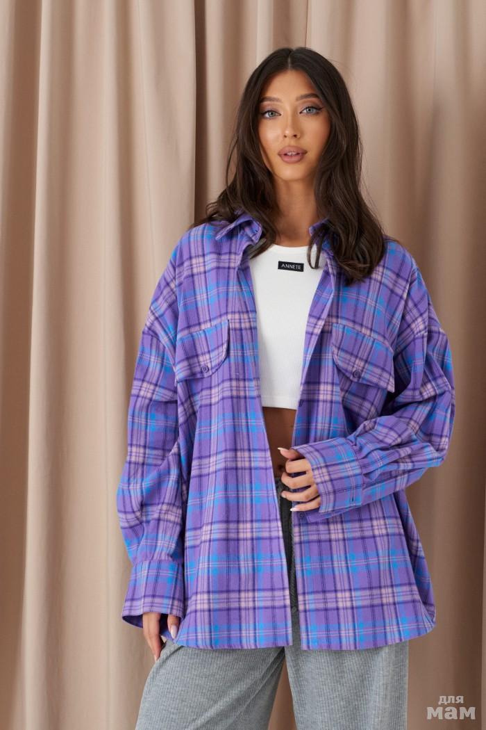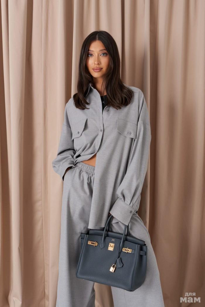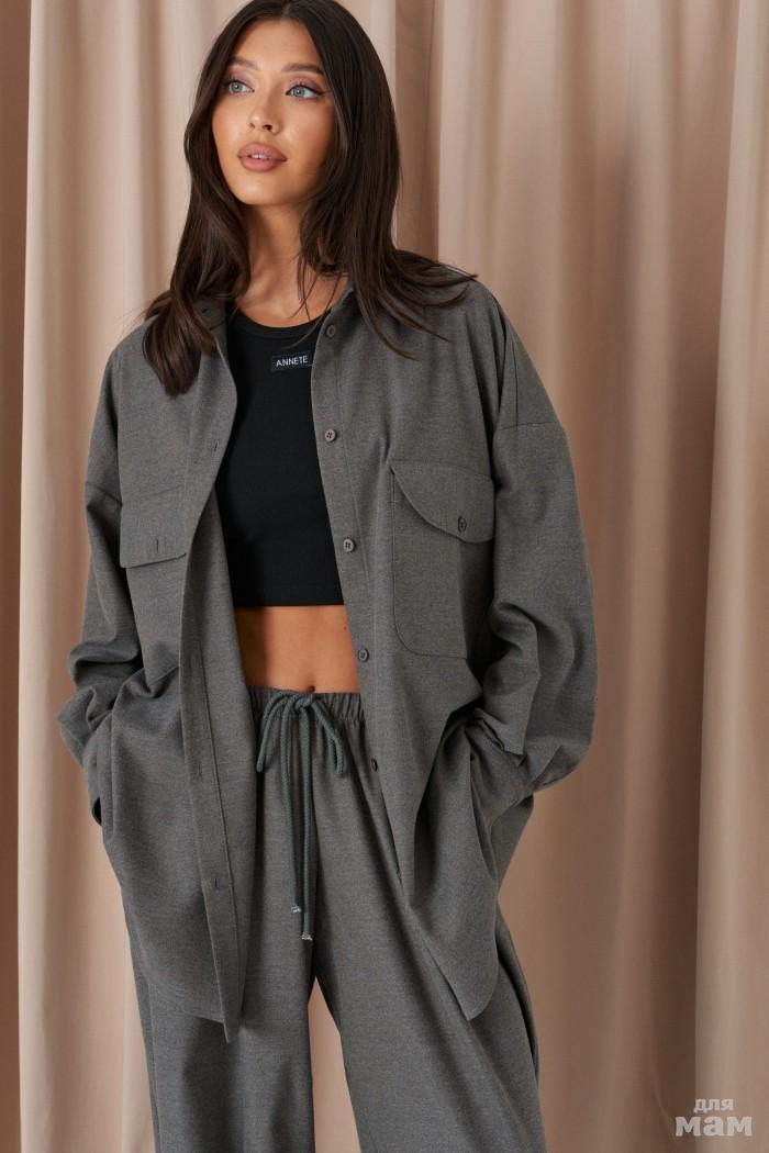 Рубашка прямого свободного кроя. Выполнена из мягкого текстильного полотна светло-серого цвета. Воротник отложной. Застёжка центральная на пуговицы. По переду на уровни линии груди клапаны - имитация карманов на пуговицах. Рукав спущенный, свободный, с манжетой на пуговице. Спинка отрезная. Длина рукава от края горловины 80 см. Спинка отрезная со сборкой. Длина спинки 76 см