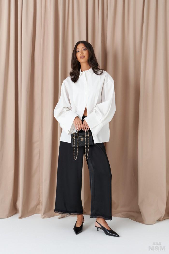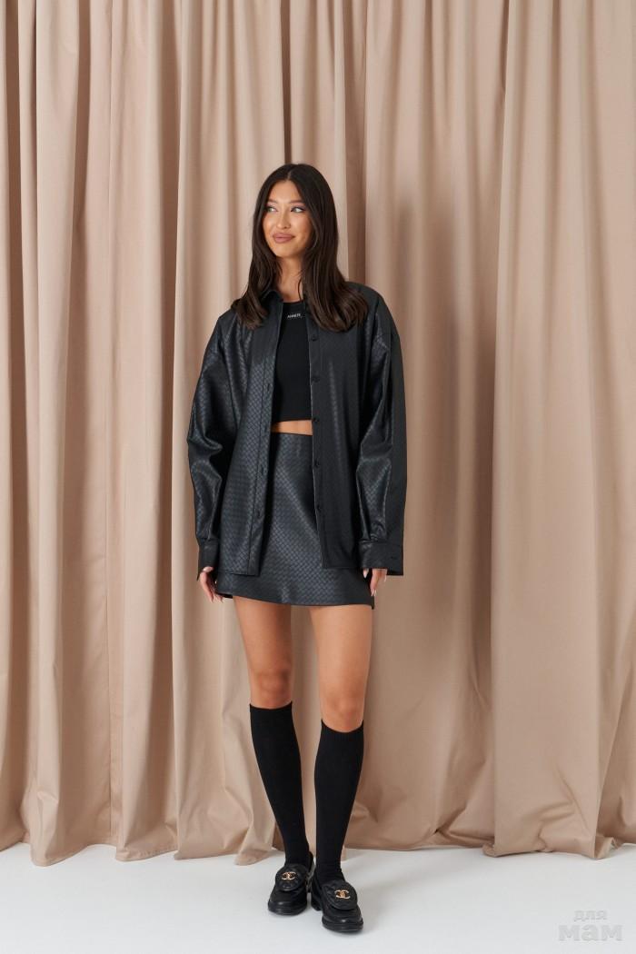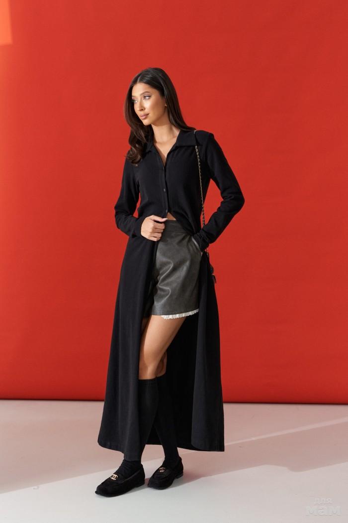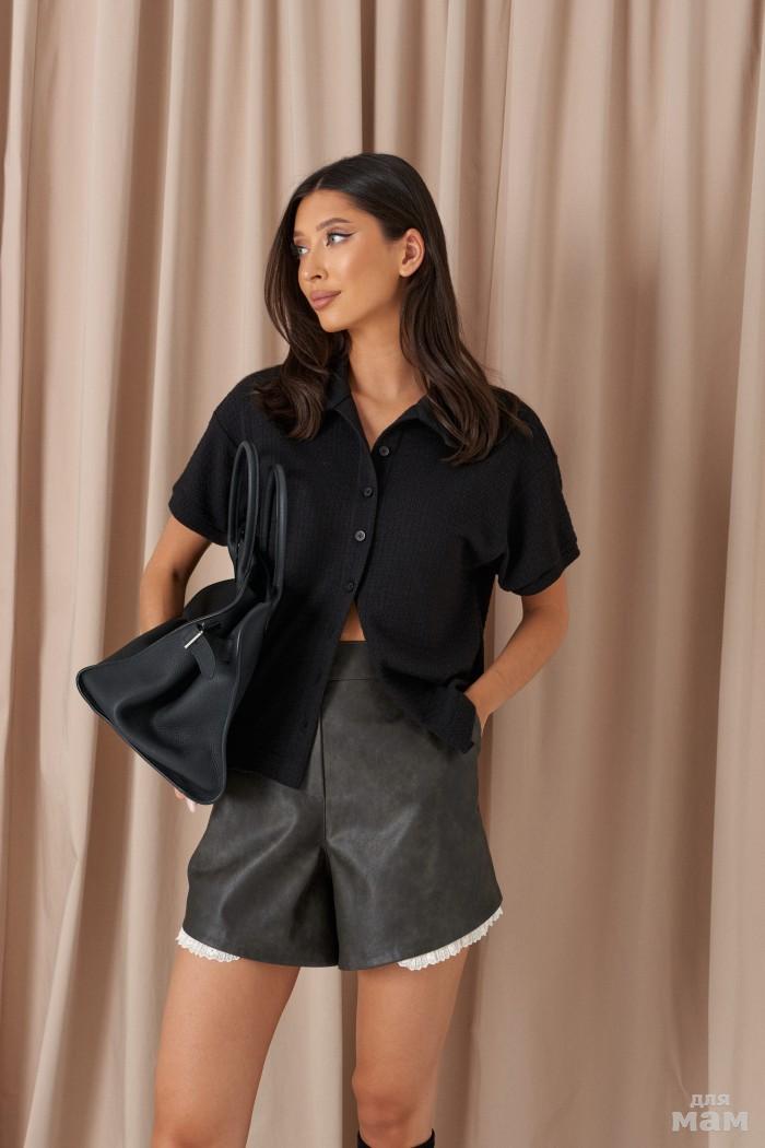 Рубашка прямого свободного кроя. Выполнена из фактурной эко-кожи чёрного цвета. Воротник отложной. Рукав втачной, спущен, со складками, с манжетой с пуговицей. В боковых швах рубашки разрезы (10 см). По спинке кокетка. Застёжка центральная пуговицы. Длина спинки 69 см. Длина рукава от линии втачивания 57 см