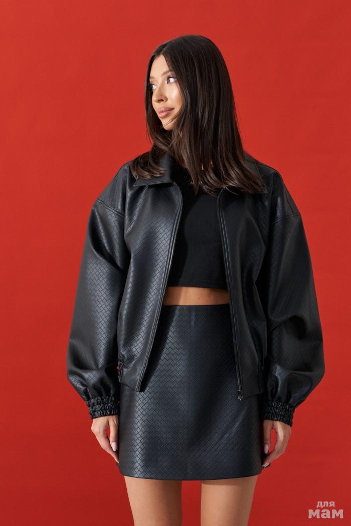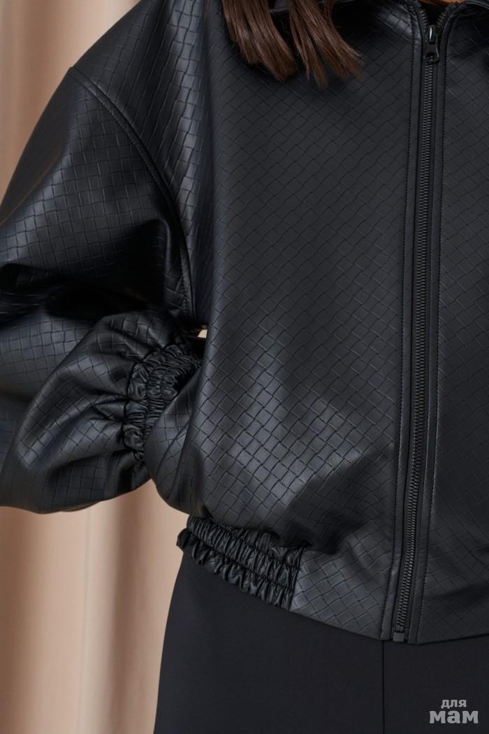Бомбер выполнен из экокожи с теснением черного цвета цвета. Характеристики: отложной воротник, застёжка на молнии, на брендированной подкладке, по переду изделия крупные накладные карманы с клапаном, спущеный рукав заканчивается манжетом-резинкой,по низу изделия резинка. Длина по спинке 54 см, длина рукава от горловины 81 см.