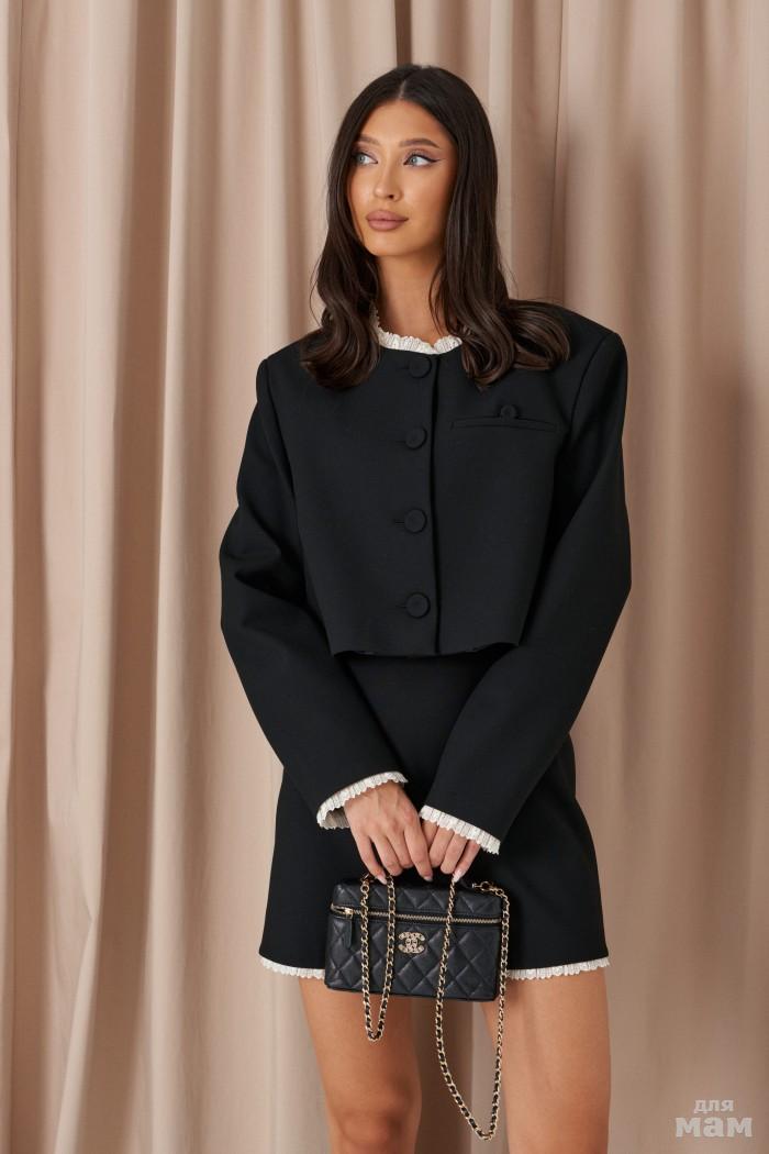 Характеристики: укороченный, подплечники, подкладка, вырез горловины круглый, по краю горловины и рукавов кружево молочного цвета, рукав втачной, застежка центральная на петли пуговички, по переду прорезной карман обманка. Длина по спинке 44 см, длина рукава 60 см.