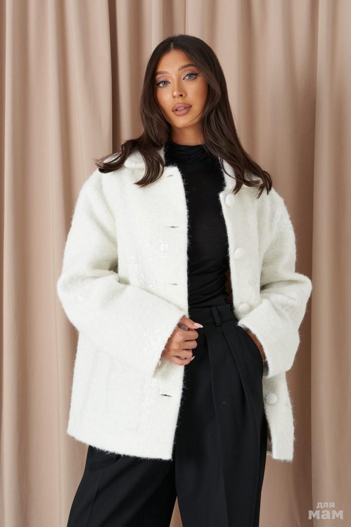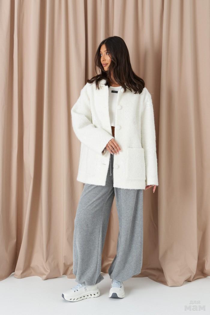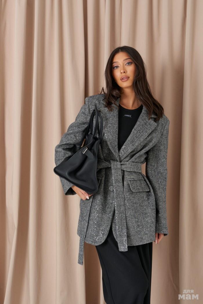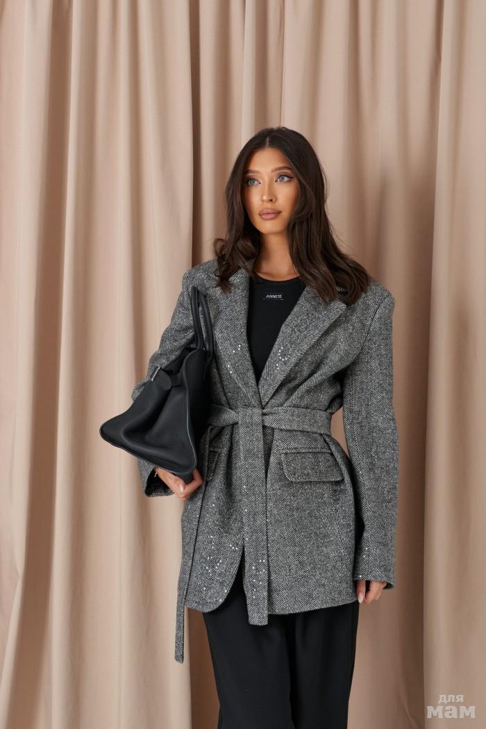Жакет прямого свободного цвета. Выполнен из фактурной ткани серого цвета со стразами и вкраплениями контрастной нити (чёрного цвета). С подкладкой. Воротник отложной, с лацканами. Рукав втачной, декорирован пуговицами. По переду карманы с клапанами. В среднем шве заднего полотна шлица (24 см). Застёжка центральная - пуговица. Длина спинки 75 см. Длина рукава от линии втачивания 62 см