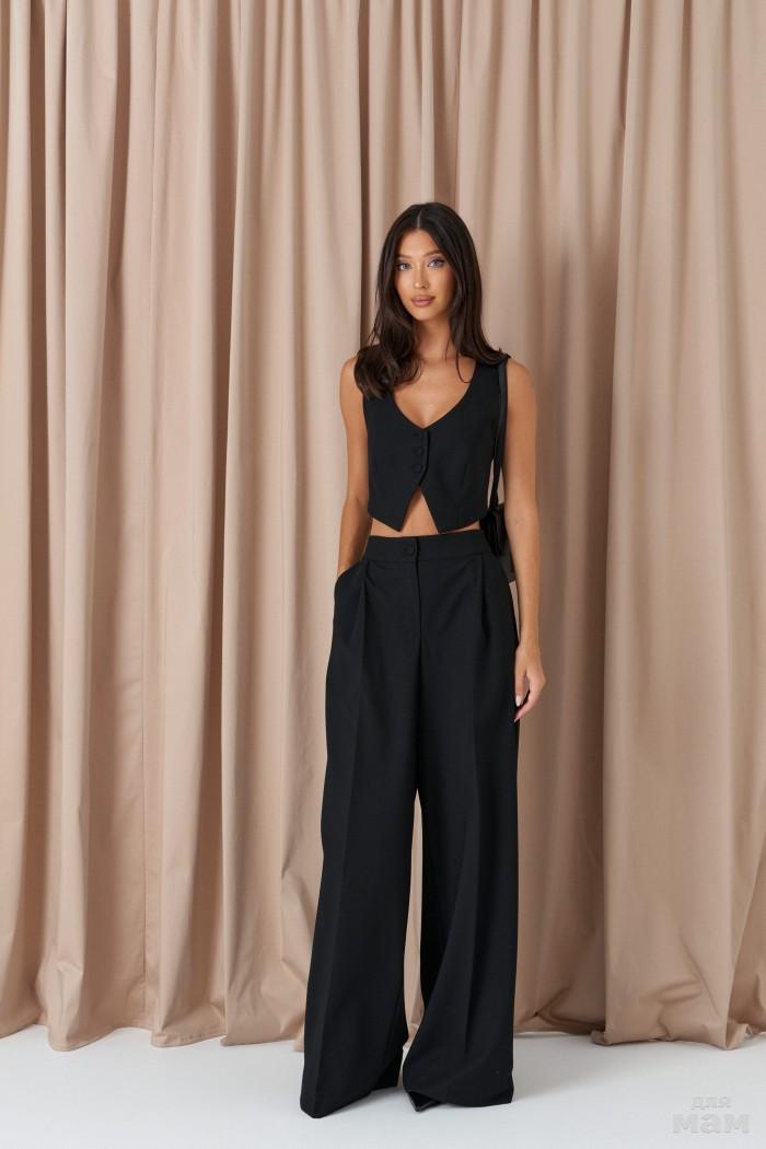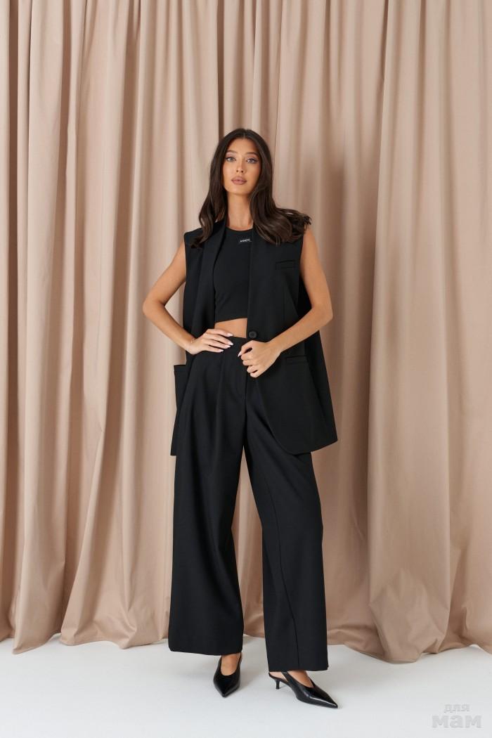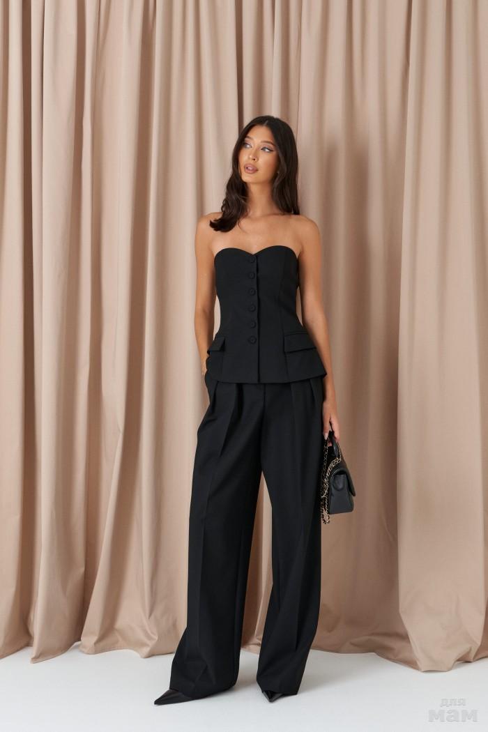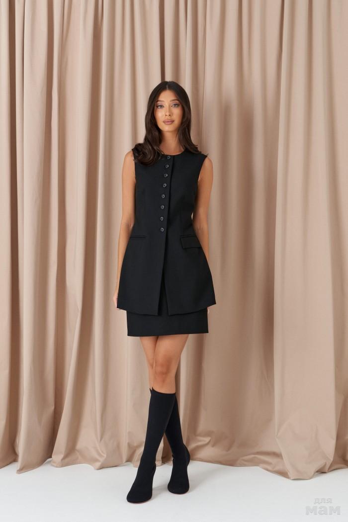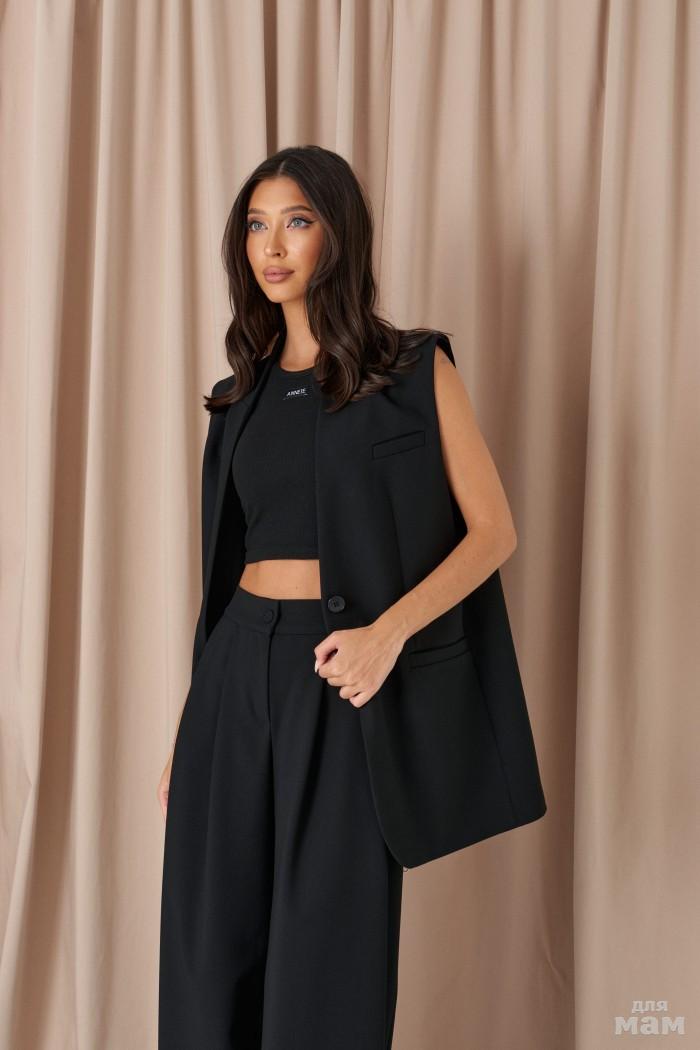 Жилет с открытыми плечами выполнен из костюмного полотна черного цвета.