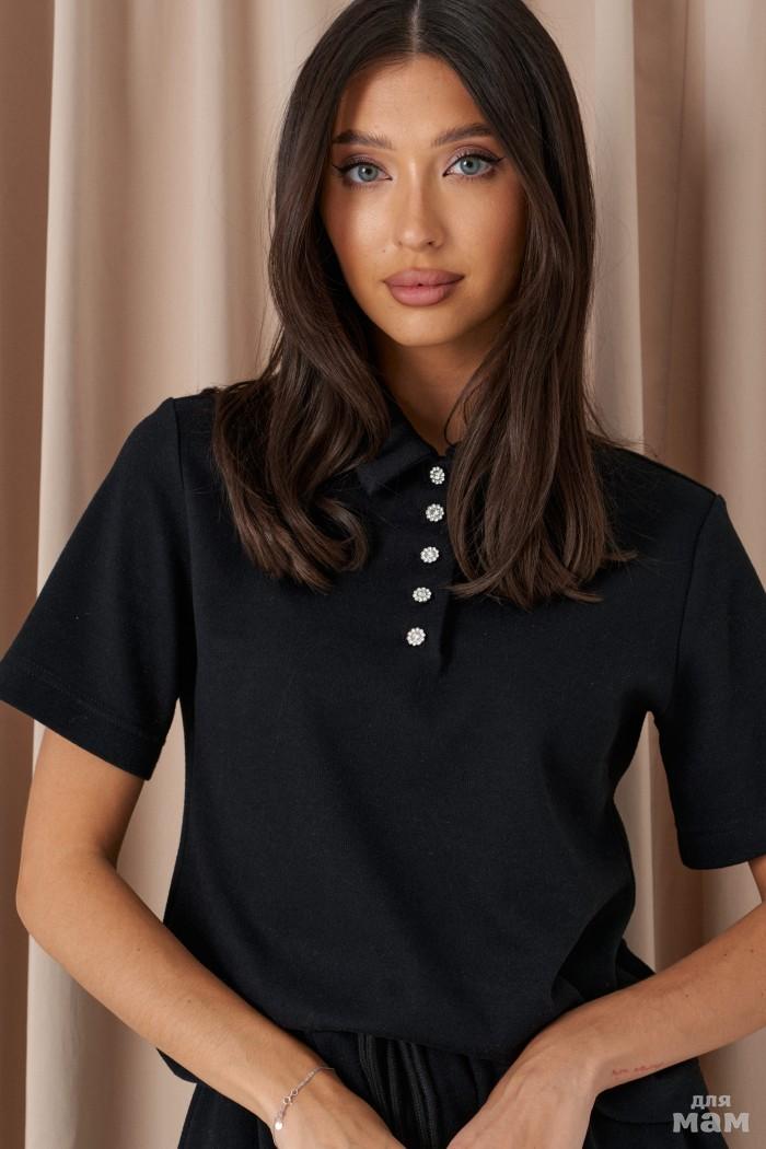 Джемпер-поло прямого кроя. Выполнен из мягкого трикотажа бордового цвета. Воротник отложной. Застёжка пуговички на планке. Рукав втачной, короткий. Длина спинки 54 см. Длина рукава от линии втачивания 20 см