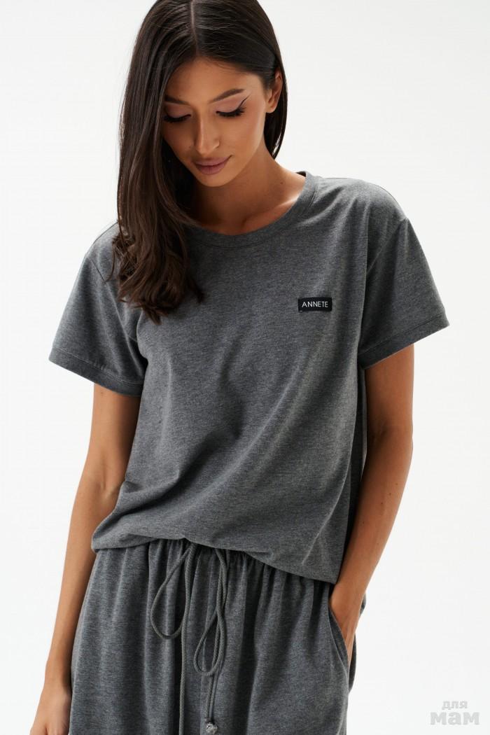 Брюки свободного кроя. Выполнены из денима серого цвета с имитацией потёртости. Пояс стабильный по переду, на резинке по спинке. Застёжка центральная пуговица, молния. От пояса складки. Из боковых швов карманы. По заднему полотну имитация карманов с клапанами. Длина 103 см