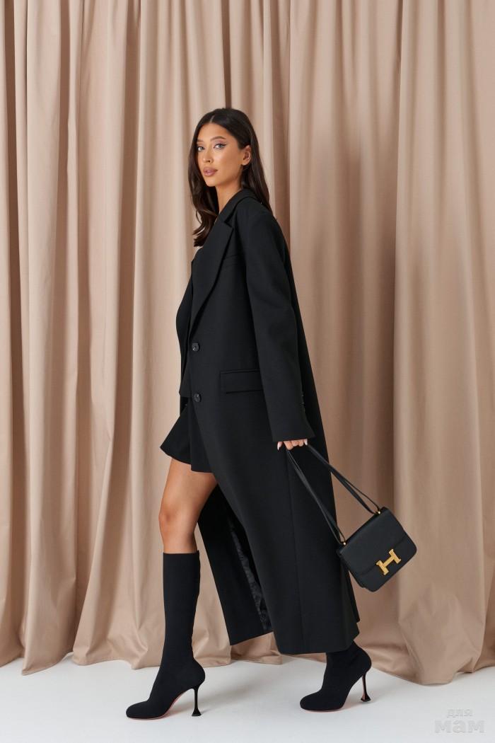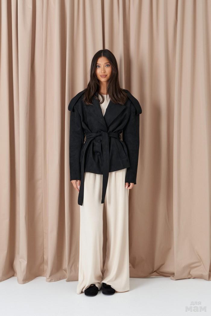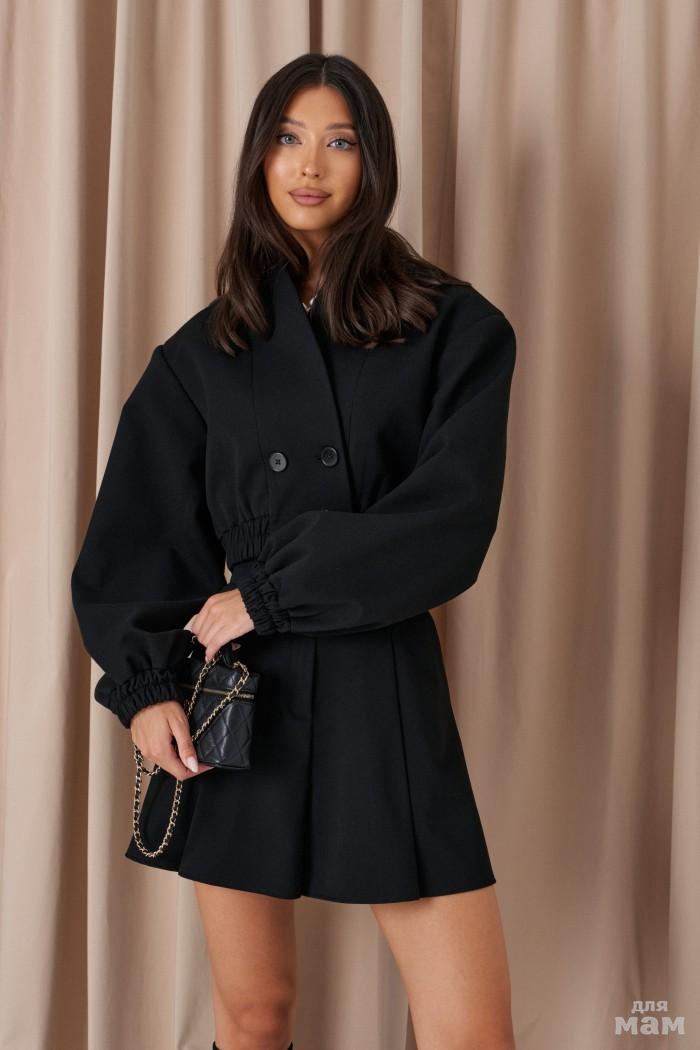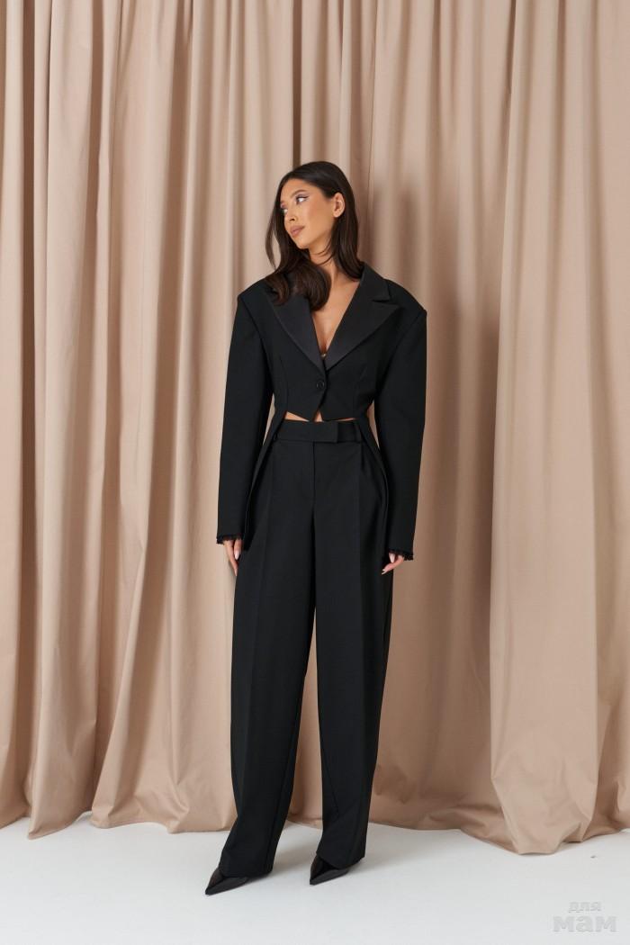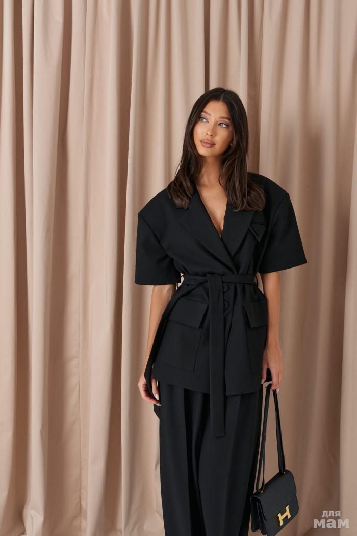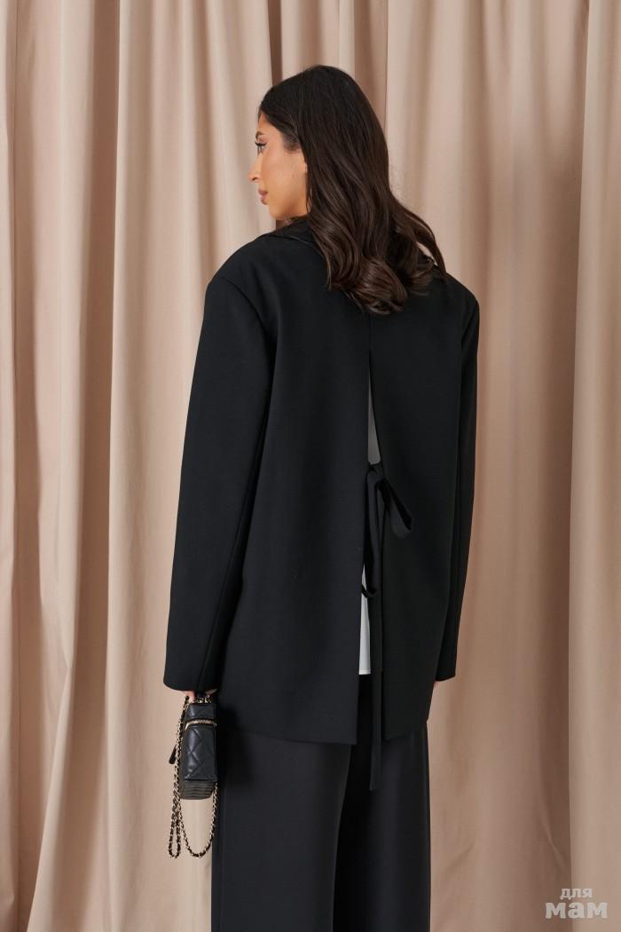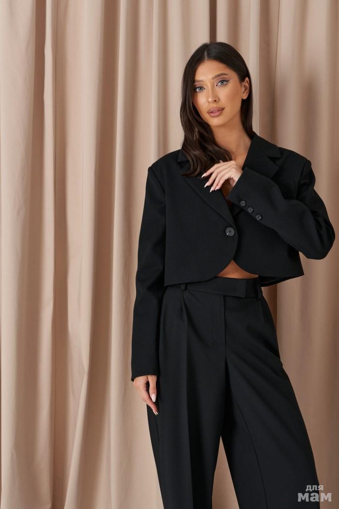 Жакет прямого кроя выполнен из костюмной ткани черного цвета.