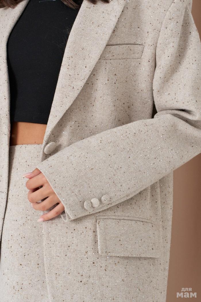 Жакет прямого свободного кроя. Выполнен из фактурной ткани бежевого цвета со стразами и вкраплениями контрастной нити (шоколадного цвета). С подкладкой. Воротник отложной, с лацканами. Рукав втачной, декорирован пуговицами. По переду внизу изделия карманы с клапаном, на уровне груди карман-листочка. Застёжка центральная - пуговицы. В комплекте пояс - из основной ткани изделия. Длина спинки 81 см. Длина рукава от линии втачивания 63 см
