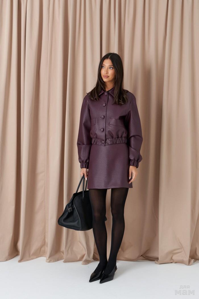 Укороченный жакет. Выполнен из фактурной эко-кожи бордового цвета. С подкладкой. Воротник отложной. Рукав втачной, немного спущен, с мантежой на резинке. Низ изделия с резинкой. По переду прорезные карманы. Застёжка центральная пуговицы. Длина спинки 49 см. Длина рукава от линии втачивания 61 см