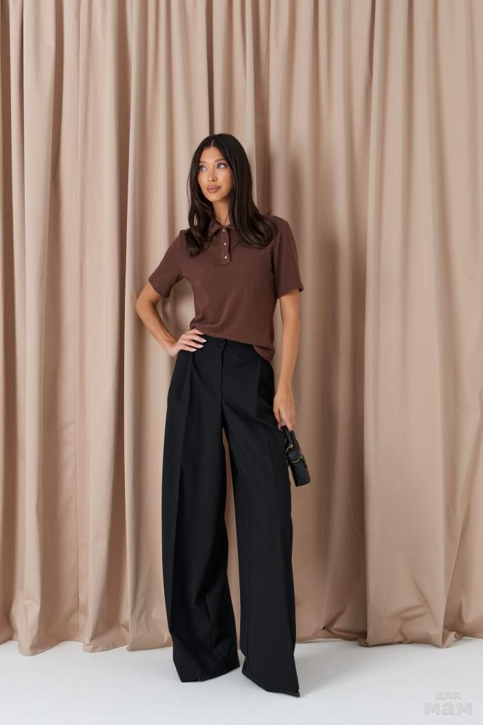 Джемпер-поло. Выполнен из трикотажного полотна в шоколадном оттенке. Характеристика: прямой крой, отложной воротник, центральная застёжка на пуговички, рукав втачной и немного спущен. Длина рукава от края горловины 78 см. Длина спинки от края горловины 60 см.
