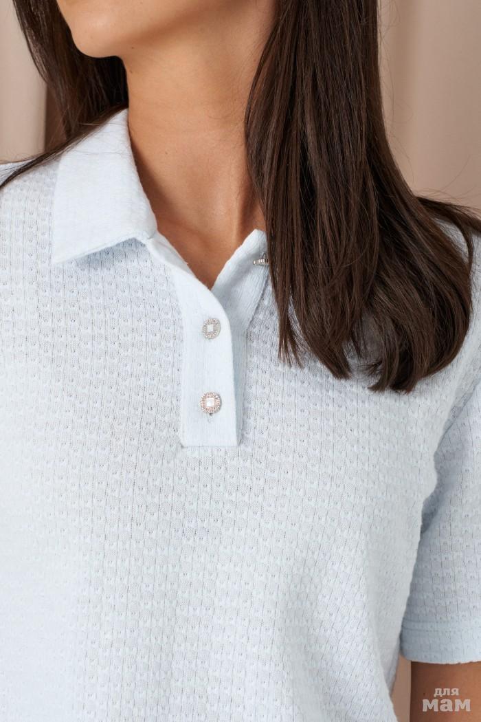 Джемпер-поло прямого кроя. Выполнен из фактурного трикотажа светло-голубого цвета. Воротник отложной. Застёжка пуговички на планке. Рукав втачной, короткий. Длина спинки 54 см. Длина рукава от линии втачивания 21 см