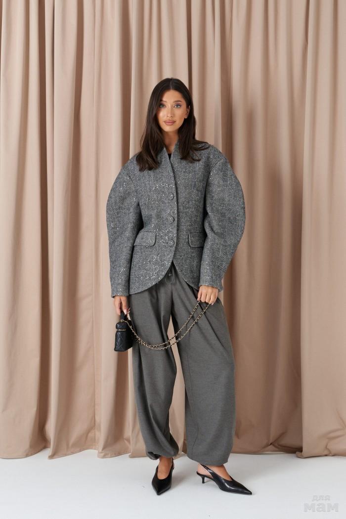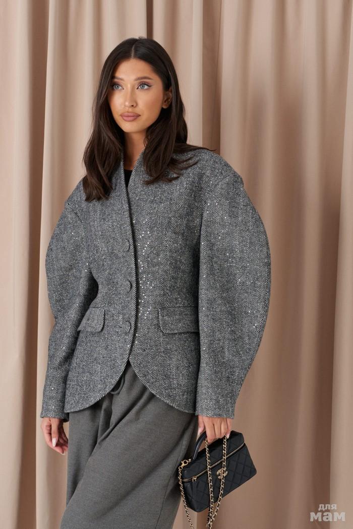 Жакет прилегающего силуэта. Выполнен из шерстяной (смесовой) ткани серого цвета с пайетками. С подкладкой. Воротник-стойка. Вырез горловины V-образный. Рукав втачной, объёмный, заужен к низу. По переду карманы с клапаном. Застёжка центральная - пуговицы. Низ жакета фигурный. Длина спинки 68 см. Длина рукава от линии втачивания 60 см
