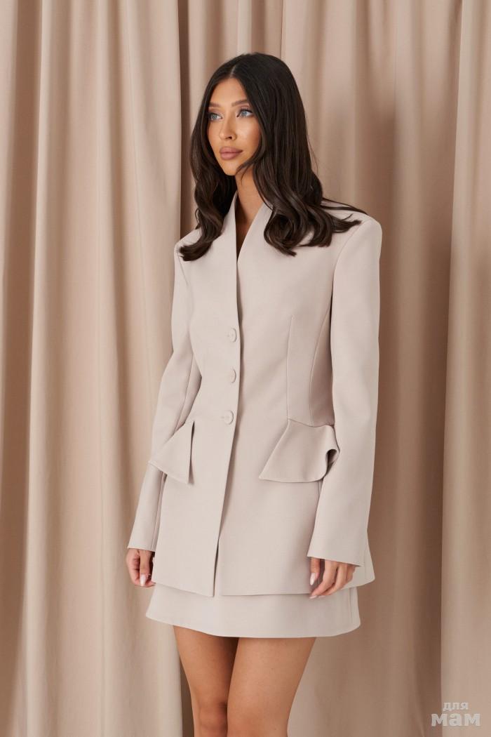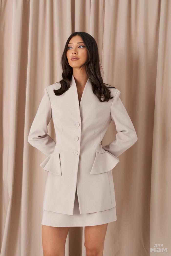 Жакет прилегающего силуэта выполнен из костюмный ткани бежевого цвета. Характеристики: прилегающий силуэт, однобортный, подплечники, вортник стойка переходяший в V-образный вырез, брендированная подкладка, застежка центральная на 3 пуговицы, рукав втачной, по низу рукава 3 пуговицы, декоративный волан, вставленный по талии. Длина по спинке от края горловины 75 см, длина рукава 64 см.