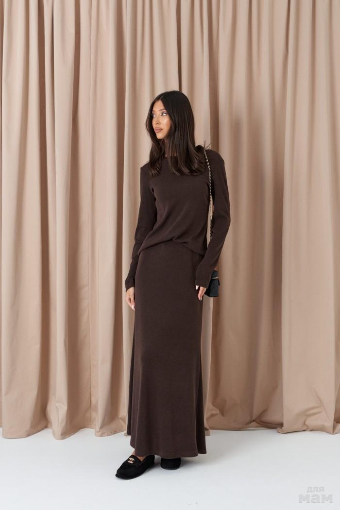 Джемпер прямого кроя выполнен из трикотажного полотна в шоколадном оттенке. Характеристики: прямой крой, овальный вырез горловины, рукав слегка спущен. Длина по спинке от края горловины 59 см, длина рукава от края горловины 26 см.