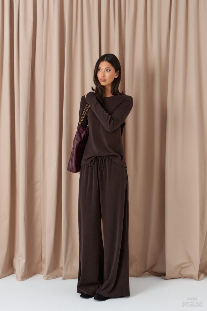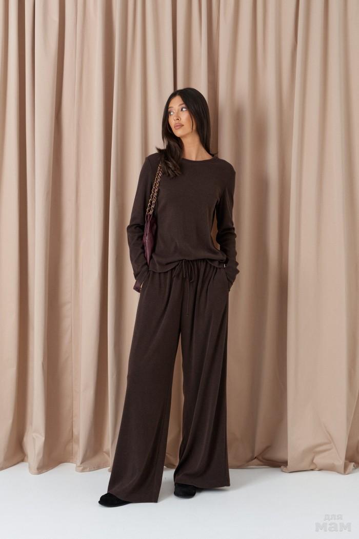 Брюки прямого свободного кроя, выполены из трикотажного полотна в шоколадном оттенке. Характеристики: прямой крой, узкий пояс на резинке с кулиской, в боковых швах карманы. Длина по боковому шву 105см.