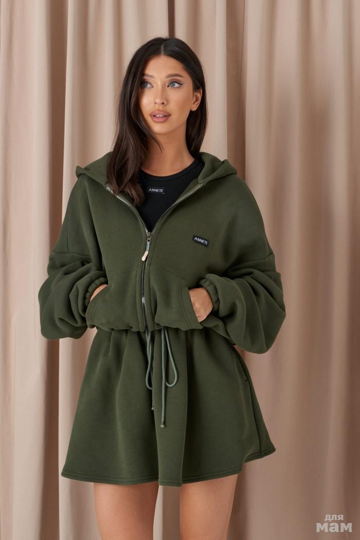 Платье мини выполнено из ткани болотного цвета. Характеристика: овальный вырез на завязках, v-образный вырез, талия на резинке, без подклада, юбка двойная, рукав свободный, на манжете резинка 84см. Длин изделия по спинке, длина рукава 72см.