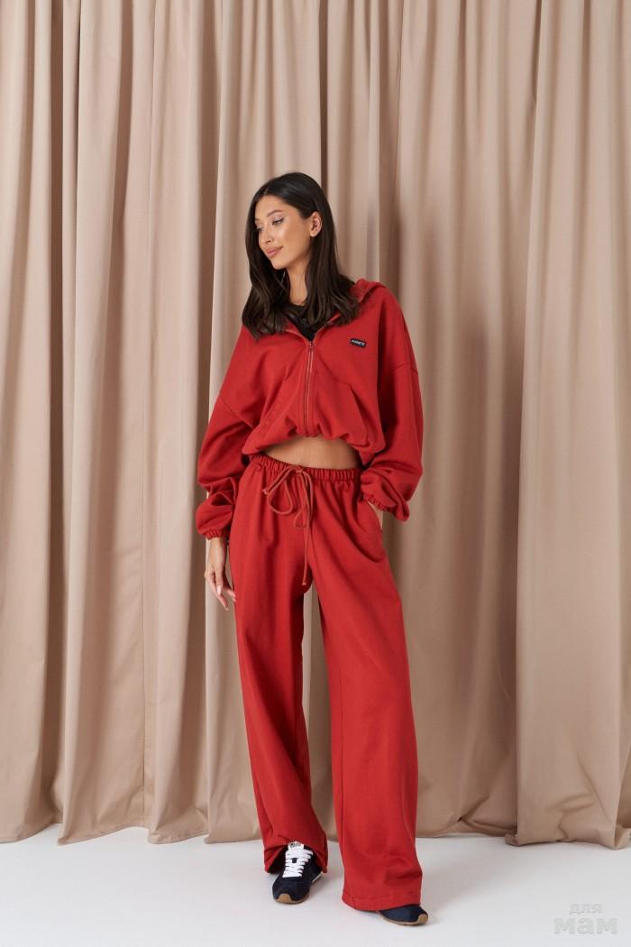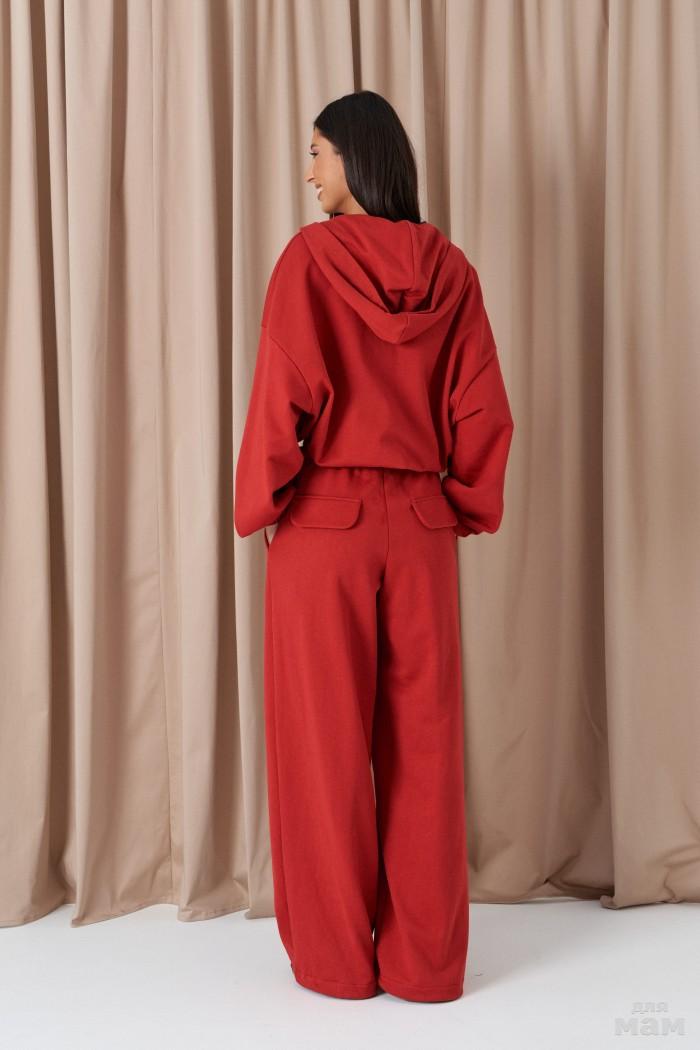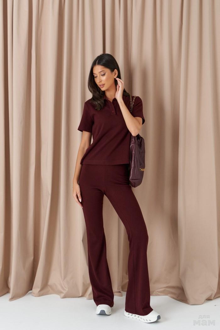 Брюки-клёш. Выполнены из плотного мягкого трикотажа бордового цвета. Пояс на резинке. Длина 113 см