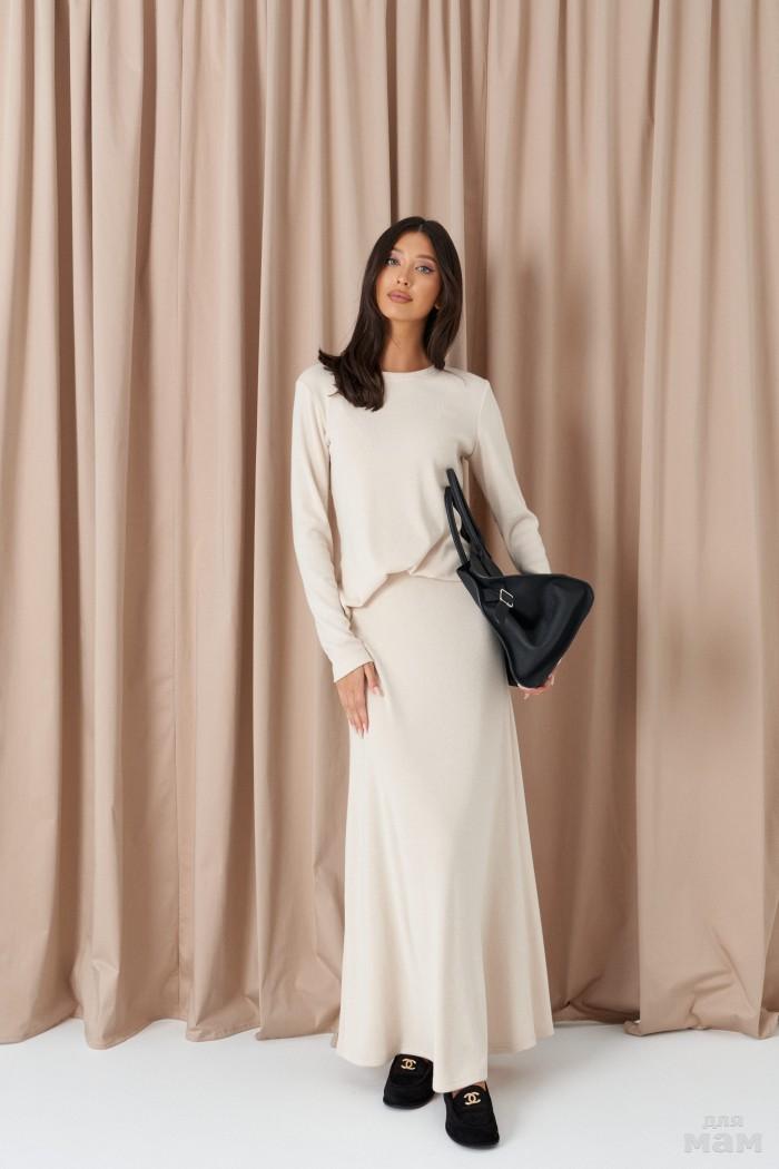 Юбка-миди прямого кроя. Выполнена из мягкого трикотажа песочного цвета. Без подкладки. Пояс на резинке. Длина 91 см
