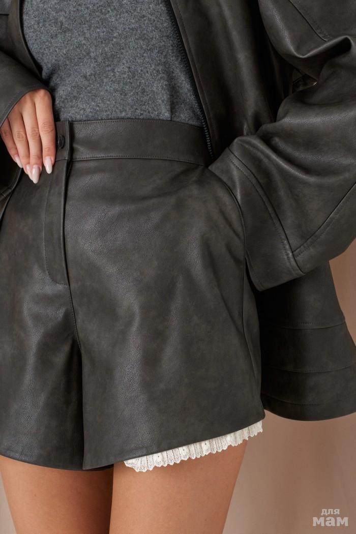 Шорты свободного кроя. Выполнены из фактурной ткани серого цвета со стразами и вкраплениями контрастной нити (чёрного цвета). С подкладкой. Пояс на резинке. В боковых швах карманы. Длина 38 см