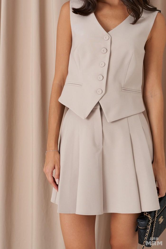 Юбка-трапеция. Выполнена из фактурной ткани бежевого цвета со стразами и вкраплениями контрастной нити (шоколадного цвета). С подкладкой. По переду имитация карманов с клапанами. Застёжка - потайная молния в среднем шве заднего полотна. Длина 43 см