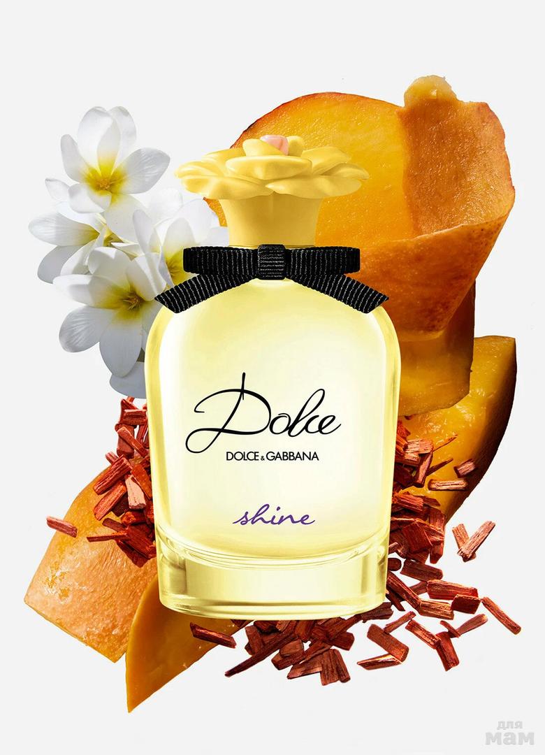 В начале звучания аромат дарит цитрусовую свежесть розового грейпфрута, терпковатый запах айвы и сладость спелого манго. В сердце композиции царит яркий, жизнерадостный цветочный дуэт шелковисто-пряного апельсинового цвета и медового жасмина. Прохлада водных нот придает центральному аккорду особую легкость, почти хрустальную чистоту звучания. Тогда как база композиции Dolce Shine окутывает теплом древесных нот сандала и светлой древесины, щедро залитым нежнейшим белым мускусом.