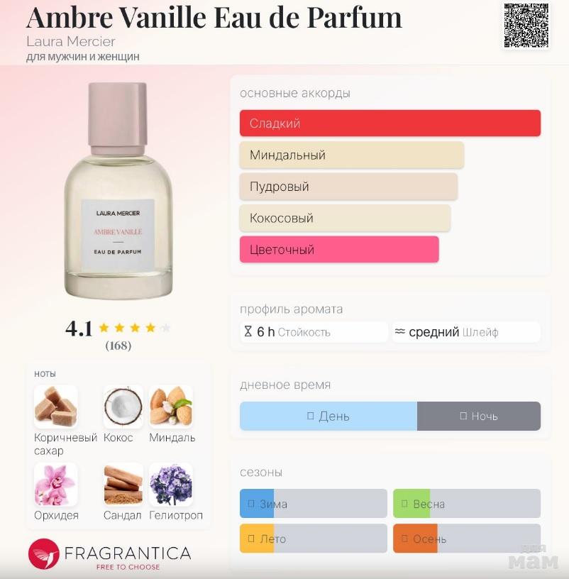 подробнее об аромате на сайте: https://www.fragrantica.ru/perfume/Laura-Mercier/Ambre-Vanille-Eau-de-Parfum-82508.html