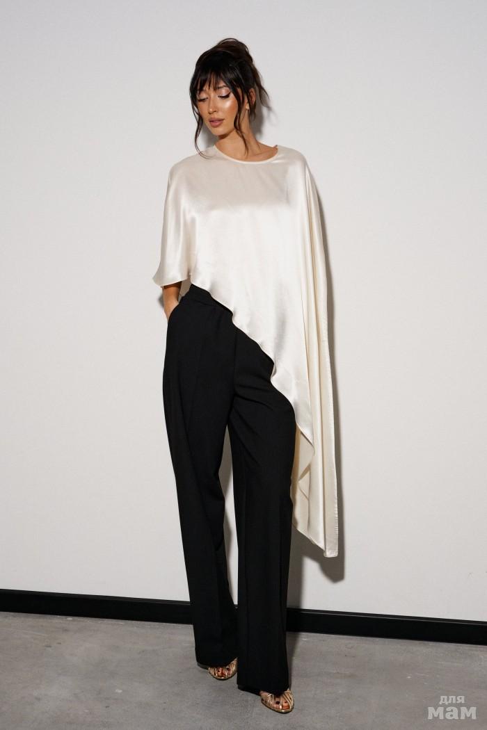 Брюки прямого свободного кроя. Выполнены из мягкой струящейся ткани чёрного цвета. Пояс на резинке. Карманов нет. Длина 109 см