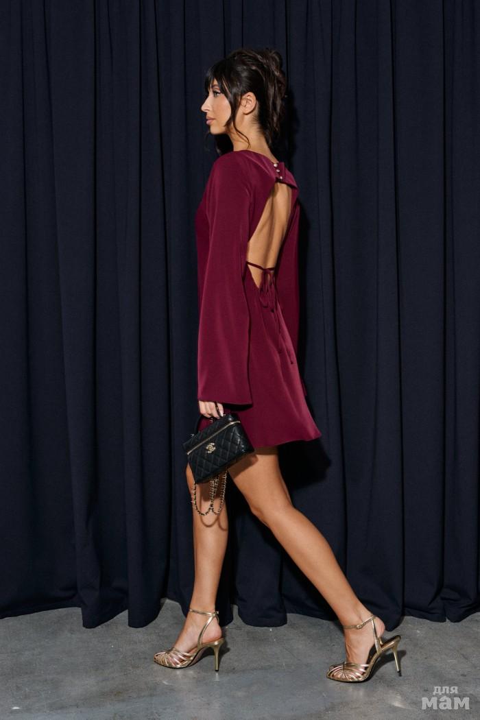 Платье полуприлегающего силуэта выполнено из плательной струящейся ткани бордового цвета. Характеристики: полуприлегающий силуэт, овальная горловина, рукав втачной расклешеный, тонкий подклад. Спинка открытая, с декоративным элементом завязок, сверху застежка на петли пуговицы. Длина по спинке 86 см, длина рукава 68 см.