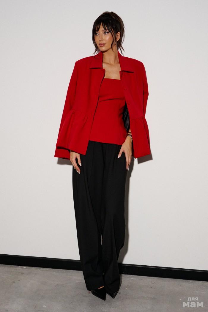 Жакет прилегающего силуэта. Выполнен из костюмной ткани красного цвета. С подкладкой. Воротник-стойка. Вырез горловины V-образный. Рукав втачной. По переду прорезные карманы. Застёжка центральная - пуговицы. Низ жакета фигурный. Длина спинки 52 см. Длина рукава от линии втачивания 62 см