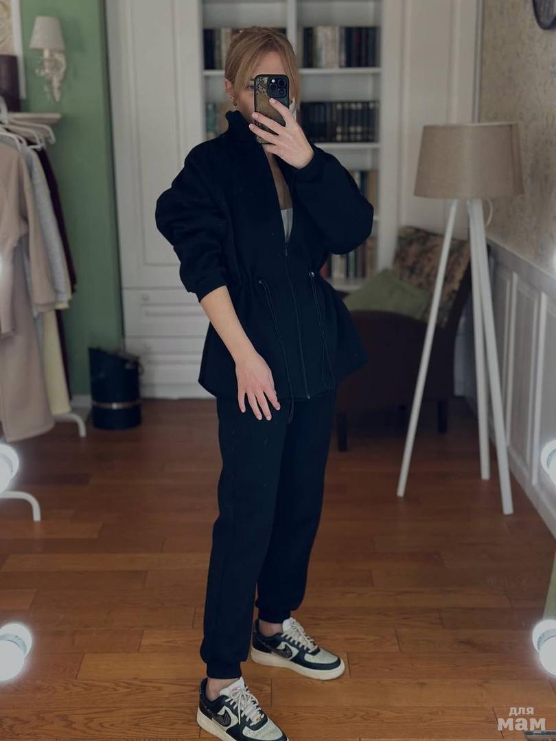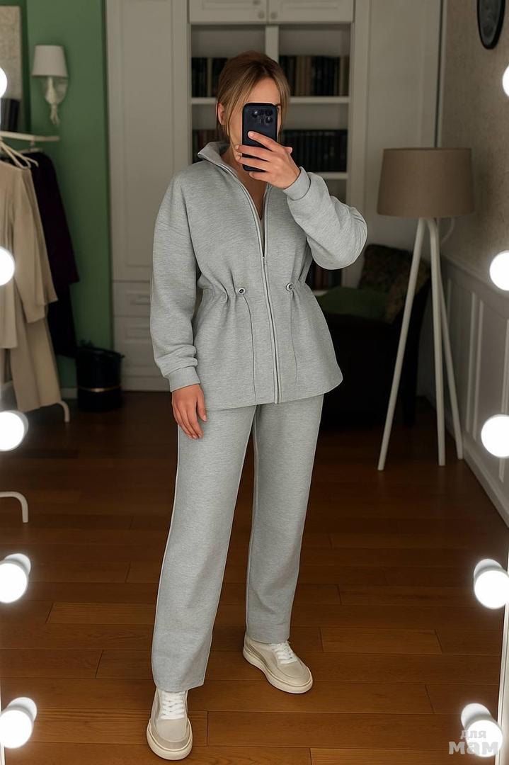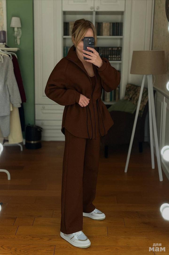Объемная кофта с кулиской — подчеркивает талию и придает шарм, а брюки прямого кроя создают идеальный силуэт.