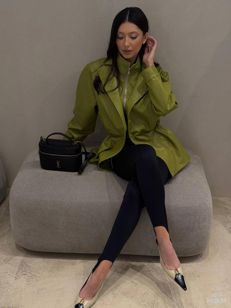 Куртка с акцентыми деталями, выполнен из эко-кожи графитового цвета. Характеристика: укороченный крой, воротник-стойка с застежкой-ремешком на кнопке, центральная застежка-замок, скрытая под планкой на кнопку сверху, плечевые швы сшиты сборкой и гармонично сочетаются с патами на кнопке, плечики, брендированный подклад, планка по низу изделия спереди, спинка отрезная, по спинке талия на резинке с кокеткой по низу, пояс в комплекте, рукав втачной слегка спущен, широкий манжет на одну кнопку. Длина рукава от края горловины 81см. Длина изделия по центру спинки 53см.