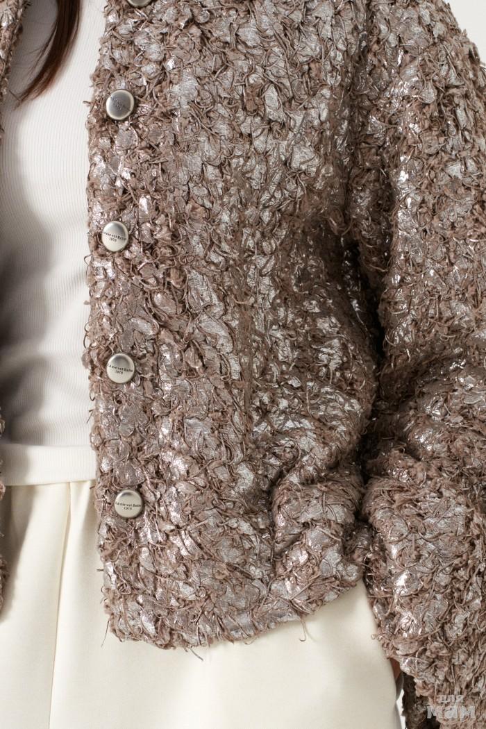Жакет свободного прямого кроя, выполнен из мягкой фактурной ткани тёмного-бежевого цвета с серебристым напылением. Характеристика: прямой крой, горловина круглая, застежка центральная на петли-пуговицы, рукав втачной спущенный, расширяется к манжету, брендированный подклад. Длина рукава от края горловины 74см. Длина по центру спинки 56 см