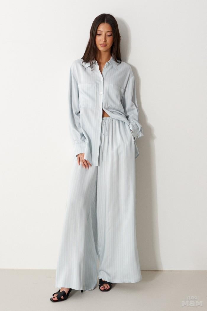 Брюки свободного кроя. Выполнены из мягкой струящейся ткани голубого цвета с белой полоской. Пояс на резинке, со шнурочком. В боковых швах карманы. Длина бокового шва (с учётом пояса) 107 см