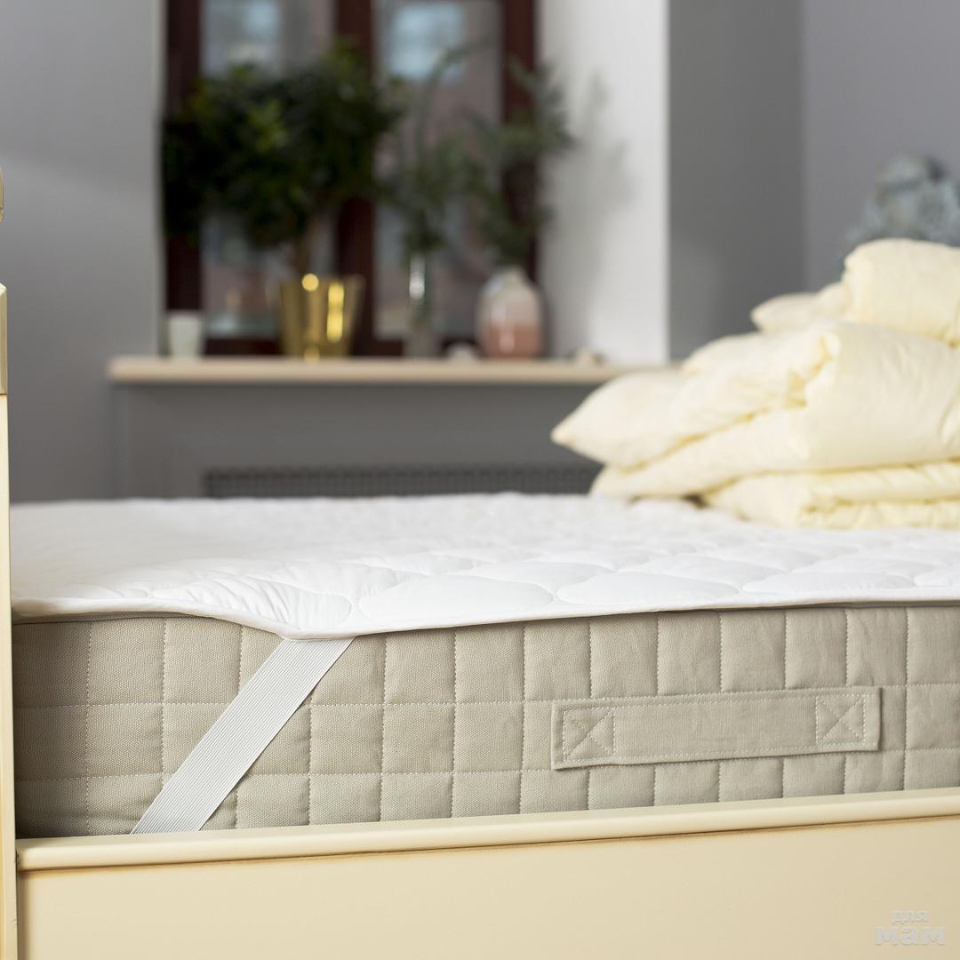 Наматрсник наилучшим образом подходит для матрасов, имеющих толщину от 10 до 30 см. Крепится к матрасу при помощи четырех резинок, расположенных по углам наматрасника. Резинки натягивются на четыре угла матраса или дивана, позволяя избежать сползания.