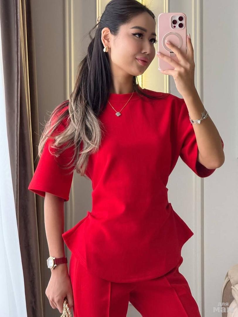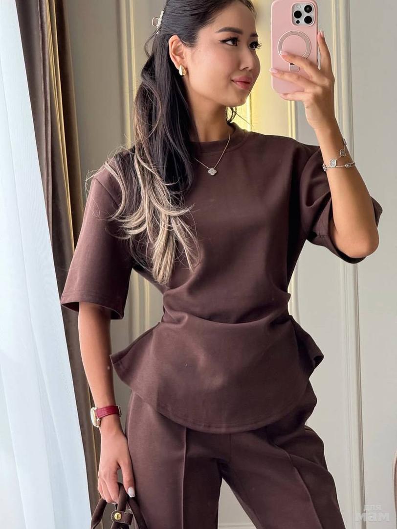 Женский костюм-двойка: приталенная футболка с мягкими драпировками по бокам и расклешённые брюки. Модель выглядит аккуратно и женственно, подчёркивает талию и делает силуэт более стройным.