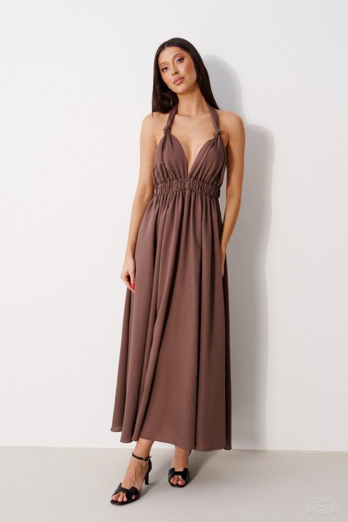 Платье приталенногосилуэта, выполнено из ткани черно цвета. Характеристика: лиф отрезной, двойнй переходящий в завязки, центральная застежка на петли-пуговицы, юбка свободного кроя, без подклада, в боковых швах карманы. Длина изделия по боковому шву от проймы 107см
