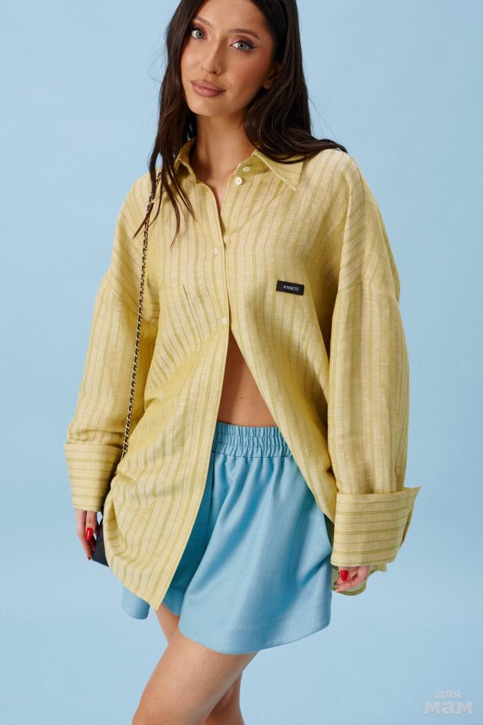 Рубашка свободного кроя. Выполнена из хлопковой (смесовой) ткани цвета "пломбир" в полоску с вышивкой лимоны. Воротник отложной. Рукав втачной, спущенный, с широкой манжетой с пуговками. На уровни груди накладные карманы с клапанами с пуговками. Спинка с отрезной кокеткой. Застёжка центральная пуговицы. Длина спинки 52 см. Длина рукава от линии втачивания 55 см