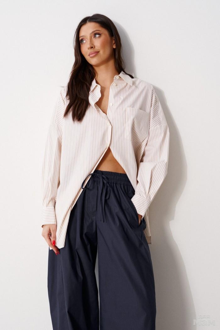 Брюки свободного кроя, зауженные к низу, по низу брюк резинка, брюки бежевого цвета в чёрную узкую полоску . Характеристика: свободный крой, брючины заужаются к низу, пояс на резинке, в боковых швах карманы, сзади изделия накладные функциональные карманы.. Длина по боковому шву 99 см.