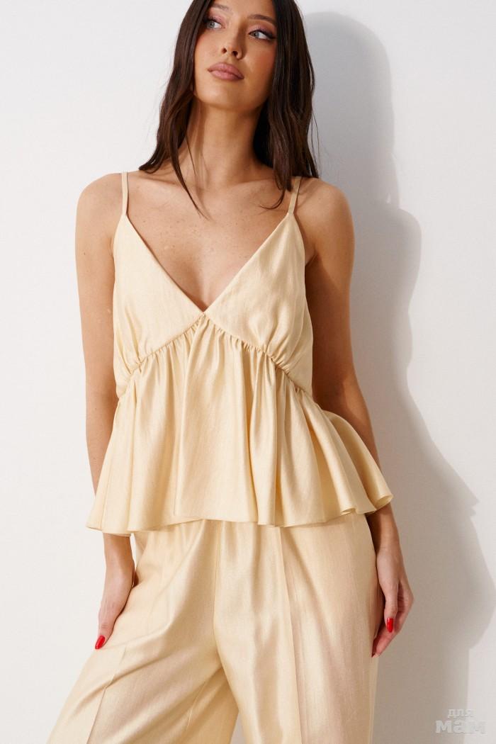 Топ прилегающего силуэта. Выполнен из мягкой трикотажной ткани тёплого белого цвета. Вырез горловины V-образный. По линии выреза горловины и по спинке кружево, переходящее в бретели. Длина спинки 35 см