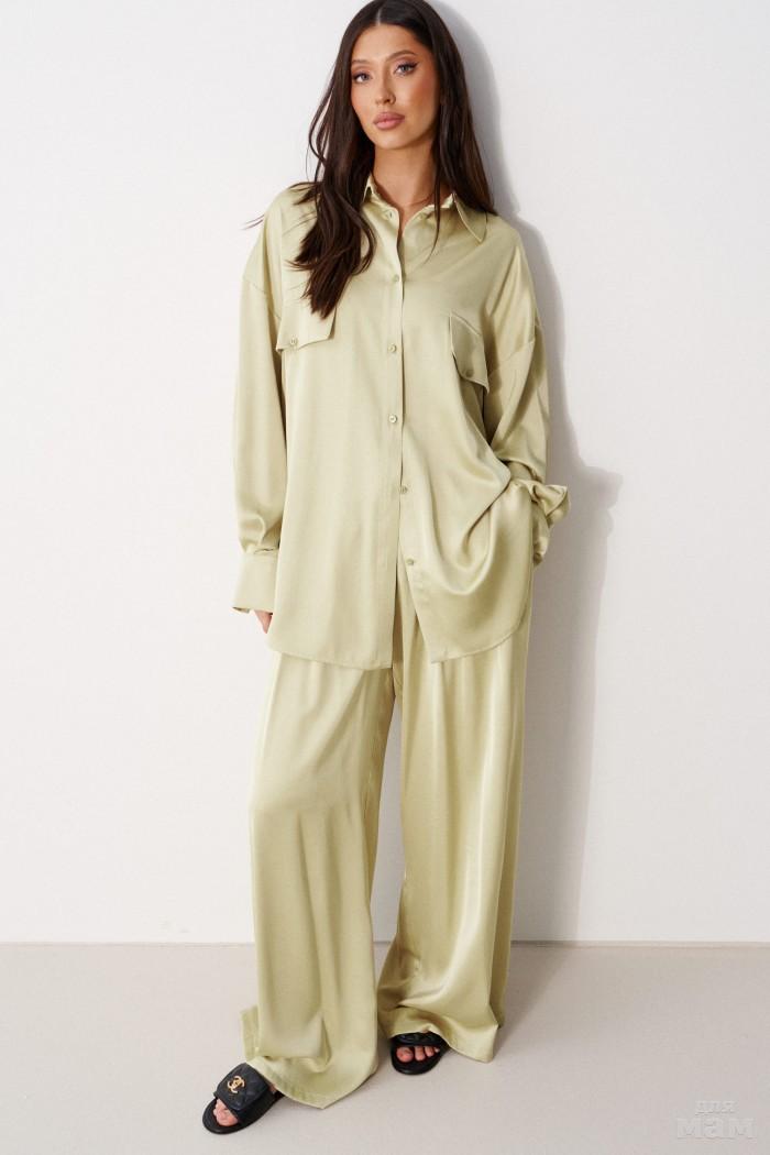 Брюки свободного кроя. Выполнены из мягкой струящейся ткани. Пояс на резинке, со шнурочком. В боковых швах карманы. Длина бокового шва (с учётом пояса) 109 см