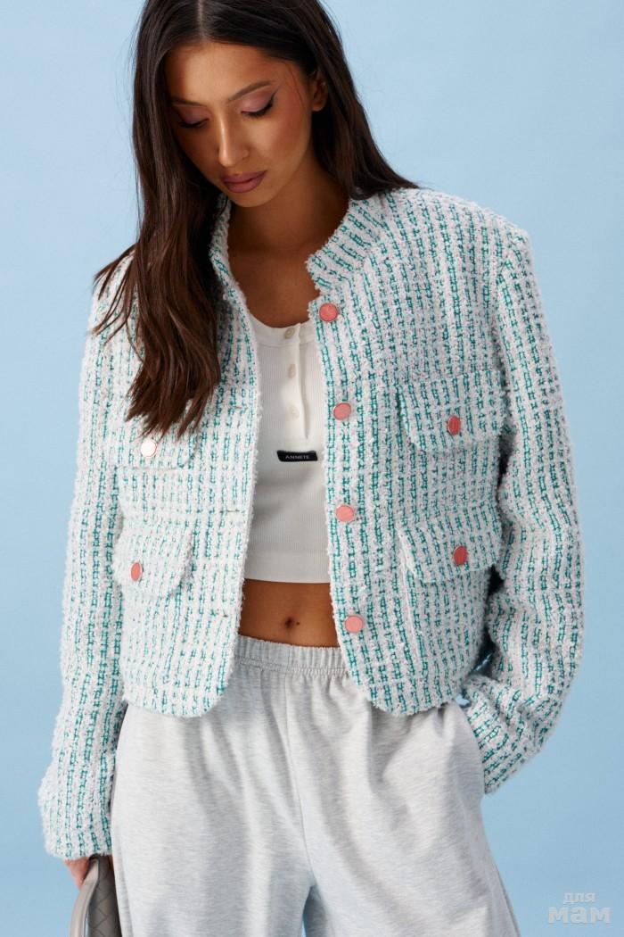 Жакет прямого свободного кроя, выполнен из фактурного твидового полотна. Характеристики: горловина стойка, застежка центральнаяна петли пуговицы, подплечники, рукав прямой, внутри брдендированная подкладка. На уровне линии груди декоративные карманы с клапаном, внизу накладные карманы с клапаном. Длина по спинке 53 см, длина рукава 65 см.