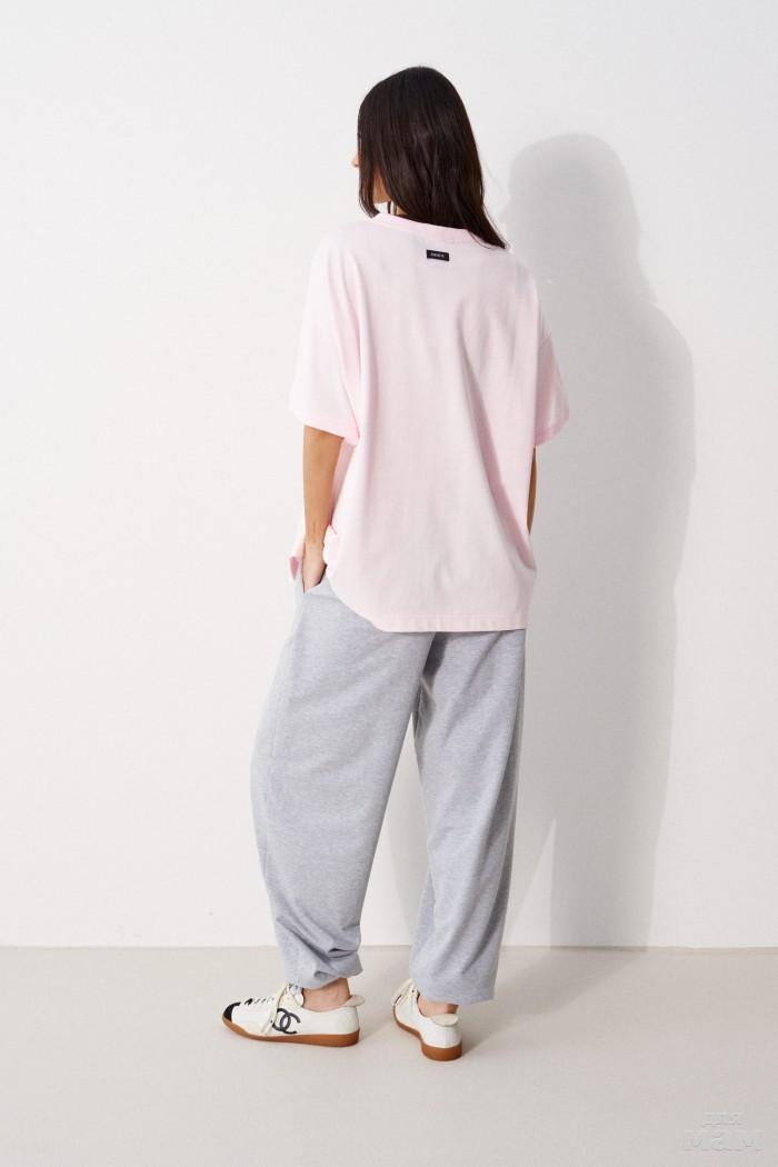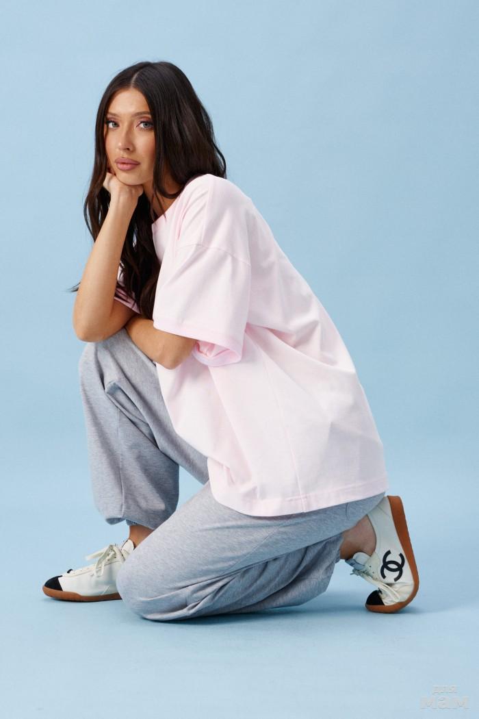 Брюки-джоггеры выполнены из трикотажного полотна нежно-розового цвета. Характеристики: прямой крой, пояс на резинке с кулиской, в боковых швах карманы, штанины внизу на резинке.