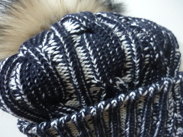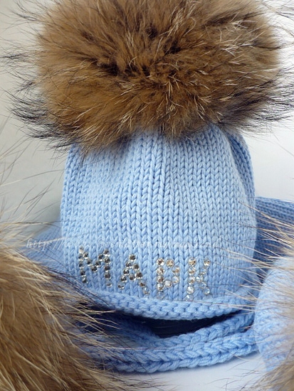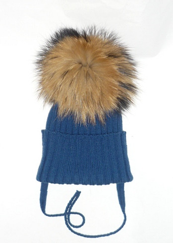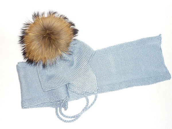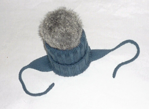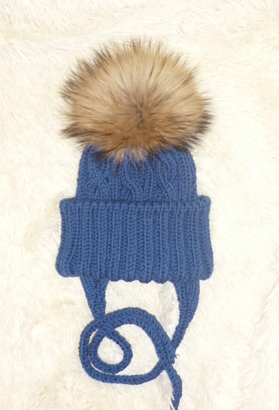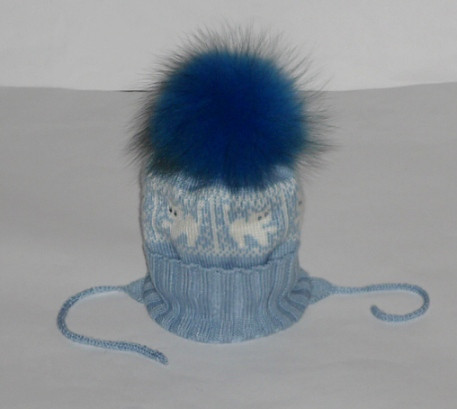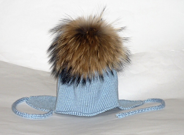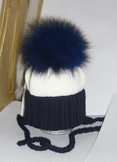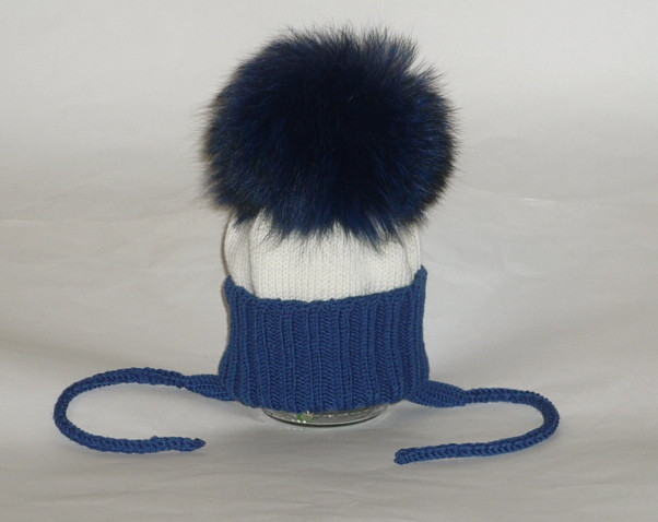 образец, двойная вязка, особенность вязки - два слоя соединены между собой, бело-синяя, помпон енот, стандарт 14-15 см, 2600 на заказ