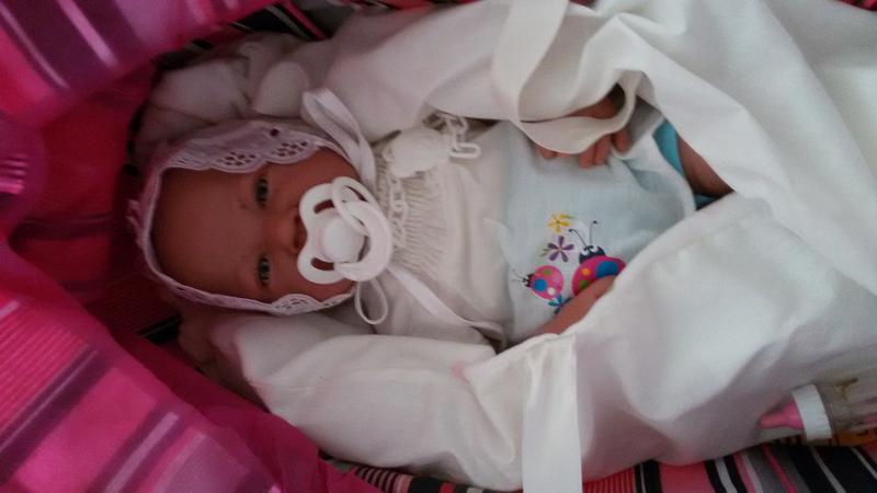 Вот и мы стали обладателями чудесной малышки. Полный восторг. Имя правда ей еще не дали. Но одежду без конца меняем. Ей даже чепчик от младшей доченьки подошел. А я и забала какая она маленькая была.