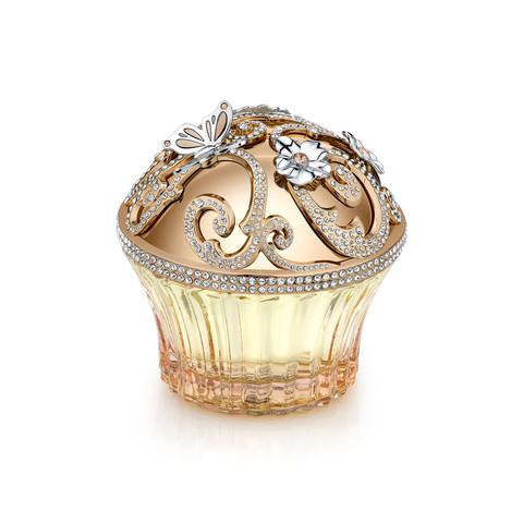 Роскошный розоватый флакон украшен россыпью мелких кристаллов.