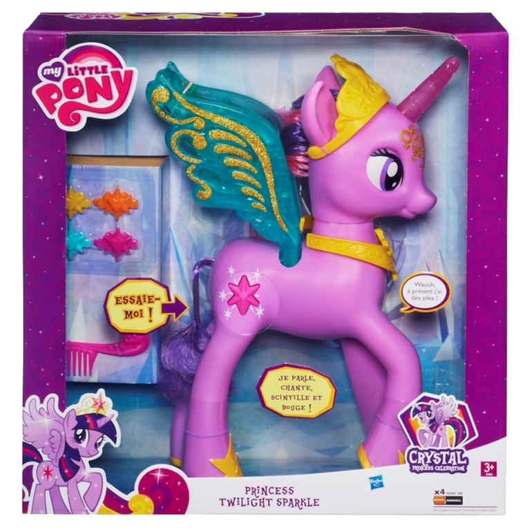 Комплектация: фигурка принцессы Твайлайт Спаркл, расческа, 2 заколки-зажима, диадема, 2 красочные насадки на крылья и 4 туфельки разных цветов.
