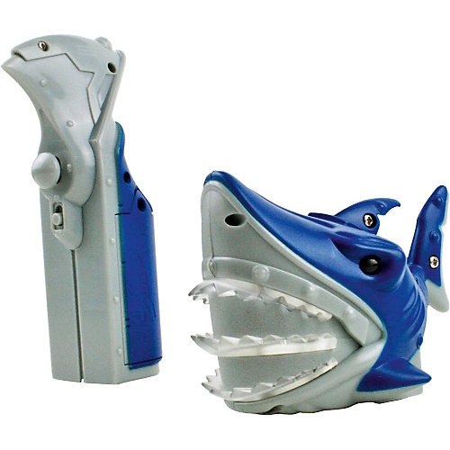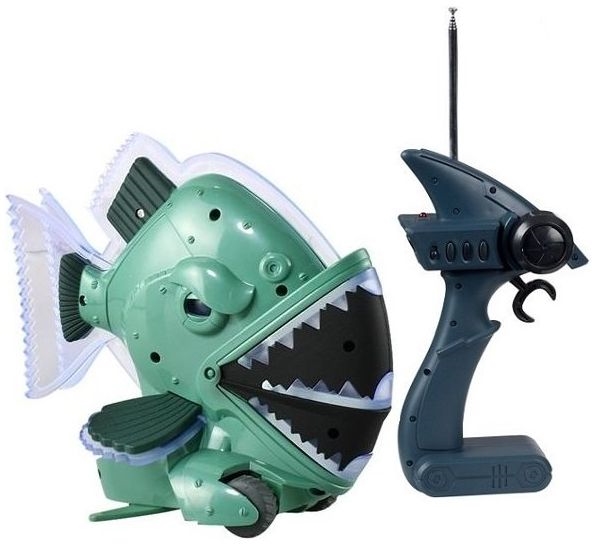 11. Игрушка от компании "Sky rocket" - грозная мини-акула. Радиоуправляемая хищница станет любимой игрушкой вашего малыша! Акула прикреплена к базе на колесиках, двигается довольно быстро в 4 направлениях: вперед/назад, вправо/влево. Управляется с помощью пульта.